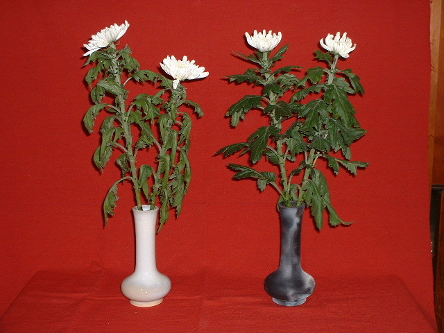 生けてから約4日後の状態です。竹炭を練りこんだ方の花瓶の花はまだ生き生きとしています。